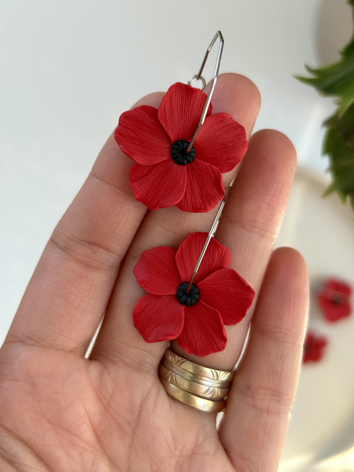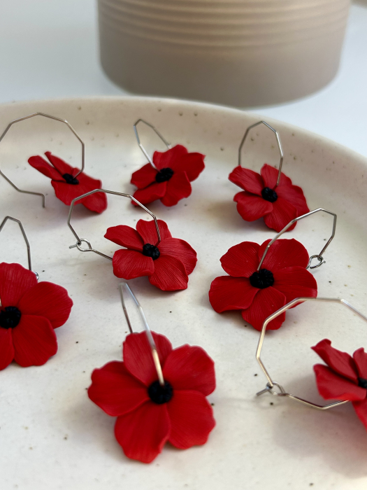 Mac, cercei modelati petala cu petala din lut polimeric, asamblati cu grija.